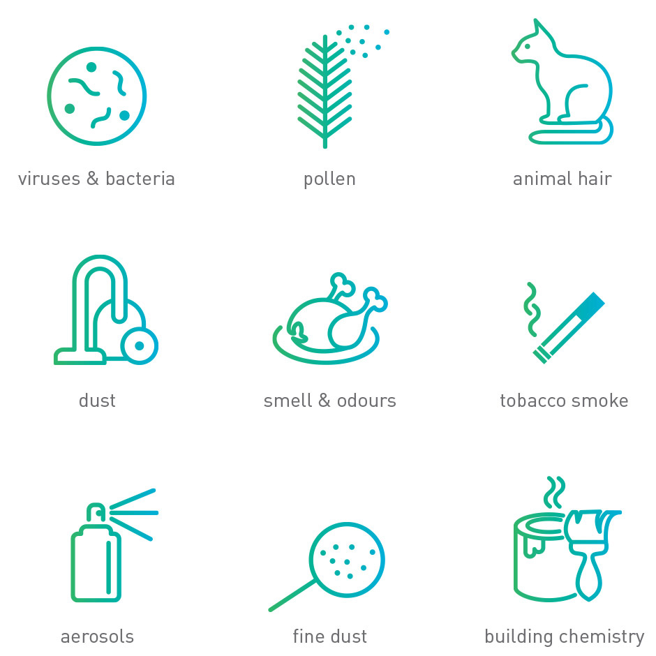 Why do we feel the air in the forest, by the sea or in the mountains is especially fresh and clean? Because nowhere else is the air purer and the ion concentration higher. This natural state is created by innovative AEON Blue® technology: High-performance, multi-stage filters cleanse the air of harmful substances. Nearly 100 percent of the following substances that are a risk for our health and well-being are filtered from the indoor air.